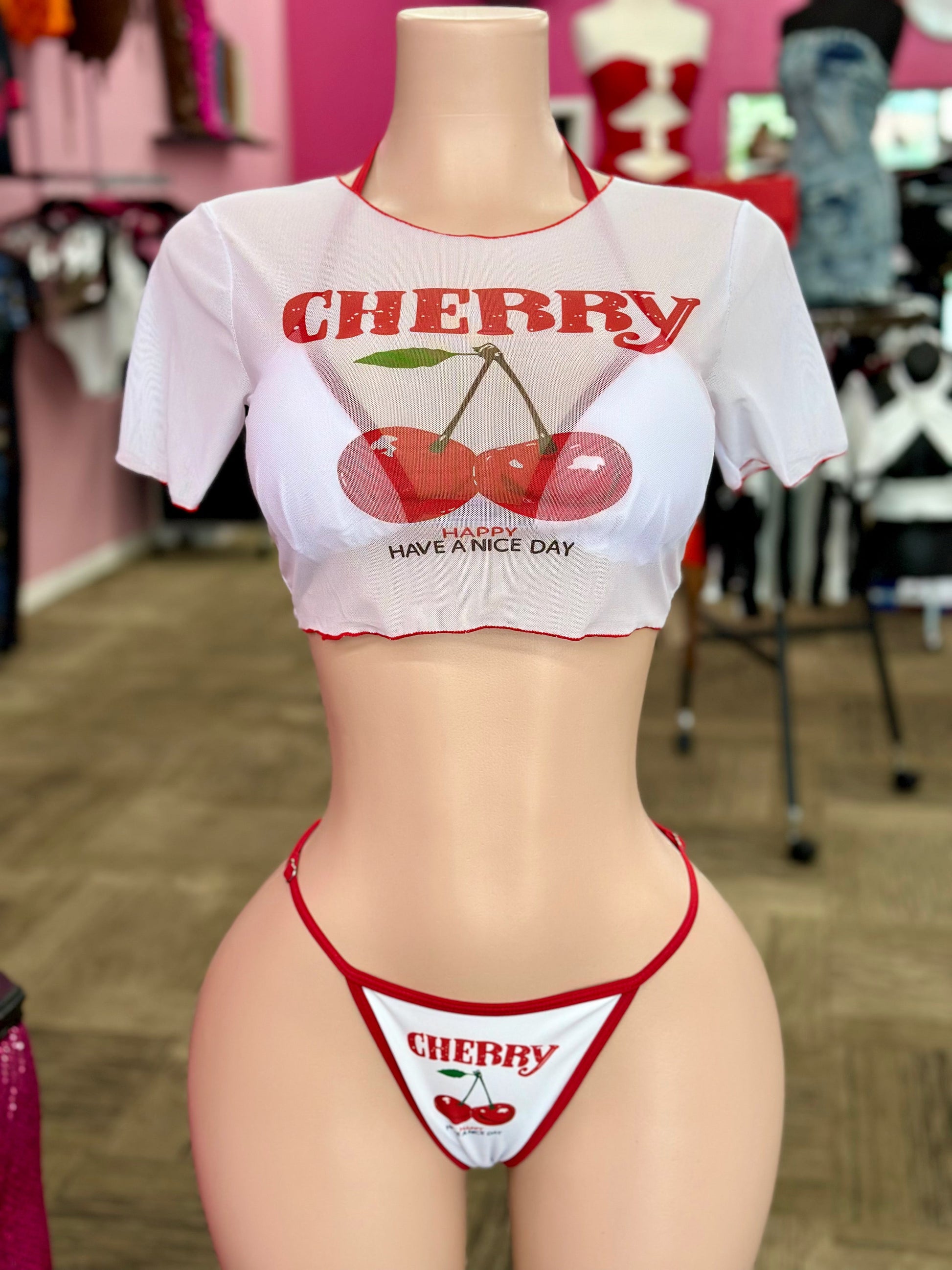 Three piece cherry design swim set. Bikini top with adjustable waist bikini bottoms. Crop mesh cover up top.