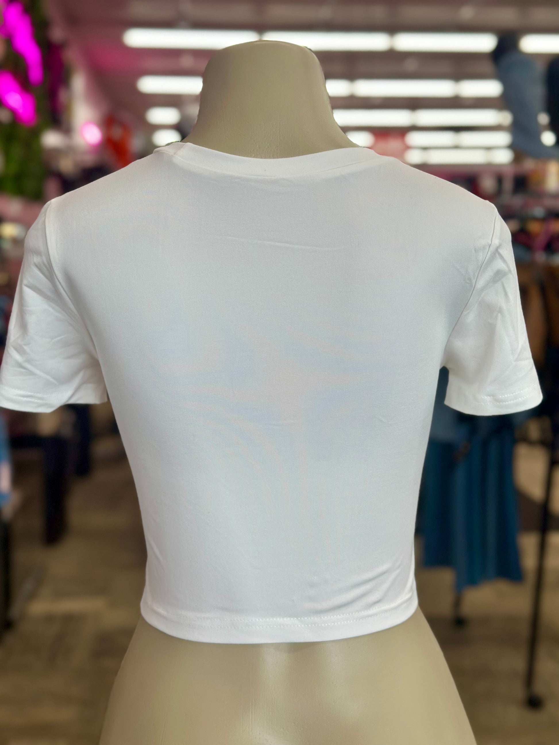 Short sleeve letter design graphic top. Stretchy material. Cropped. Fits true to size