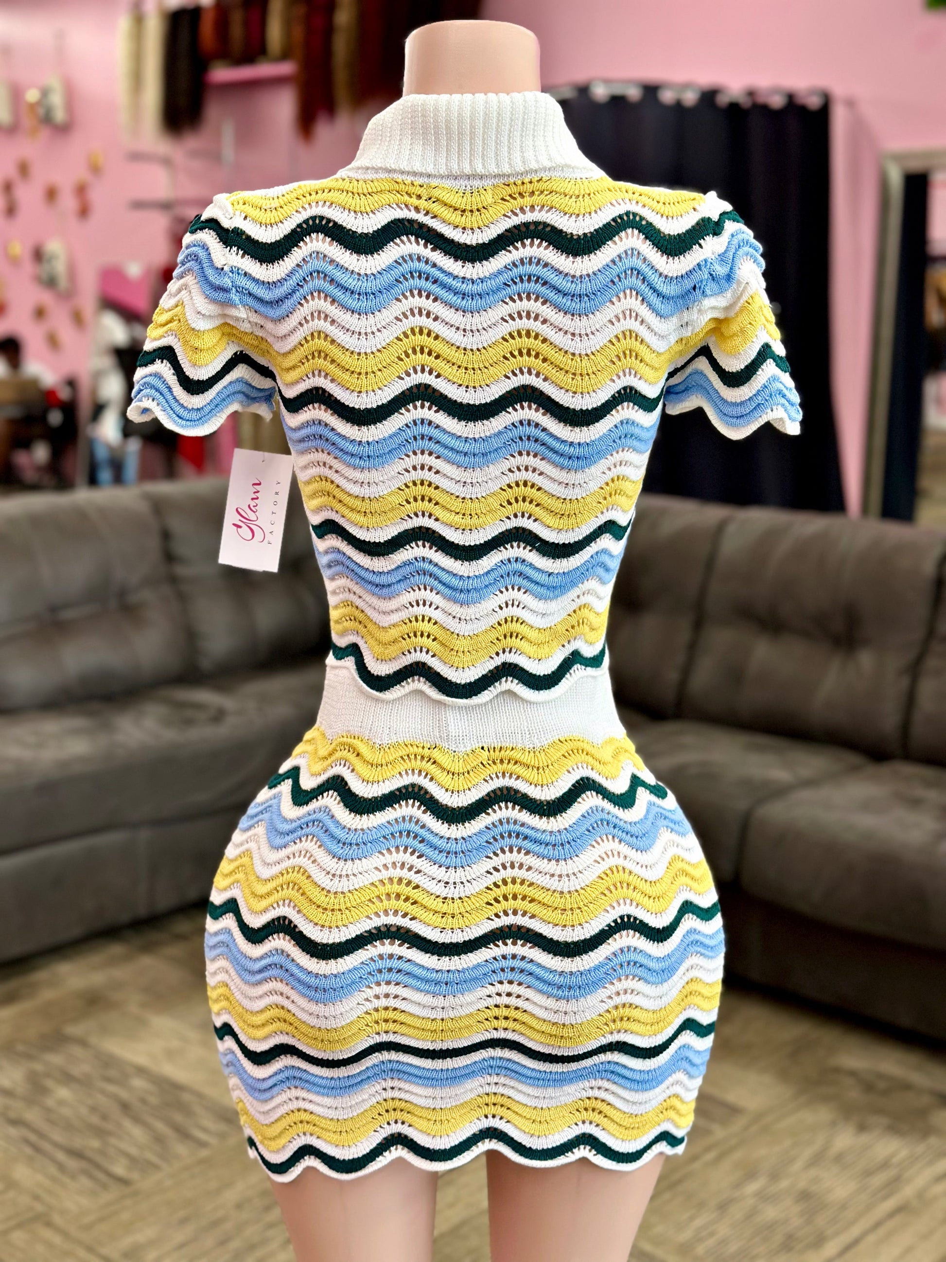 Short sleeve button down collared multicolor skirt set. Stretchy knit material. Fits true to size.