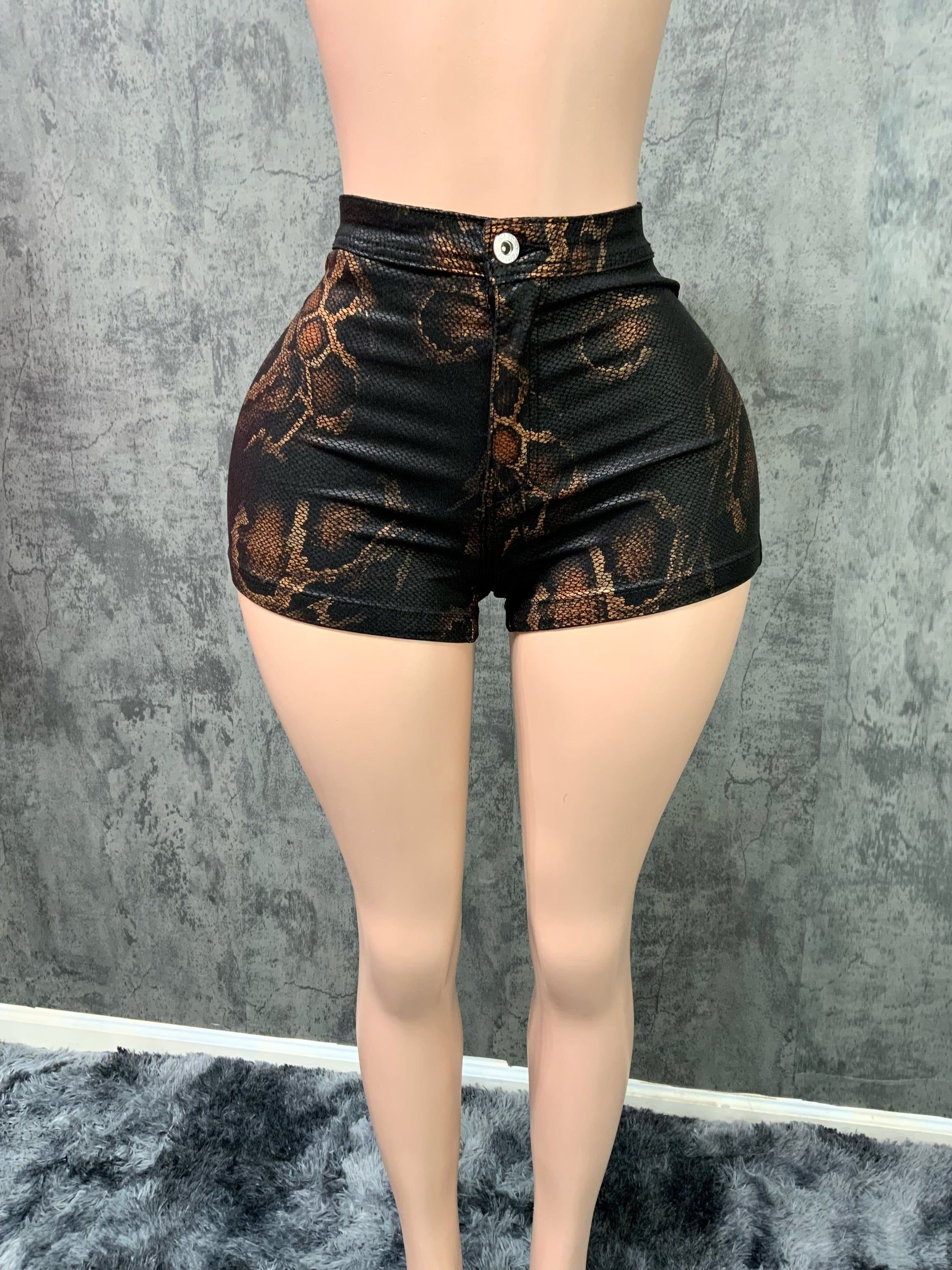 High waisted faux leather animal print shorts. Very stretchy material. Fits true to size. Model is wearing a small