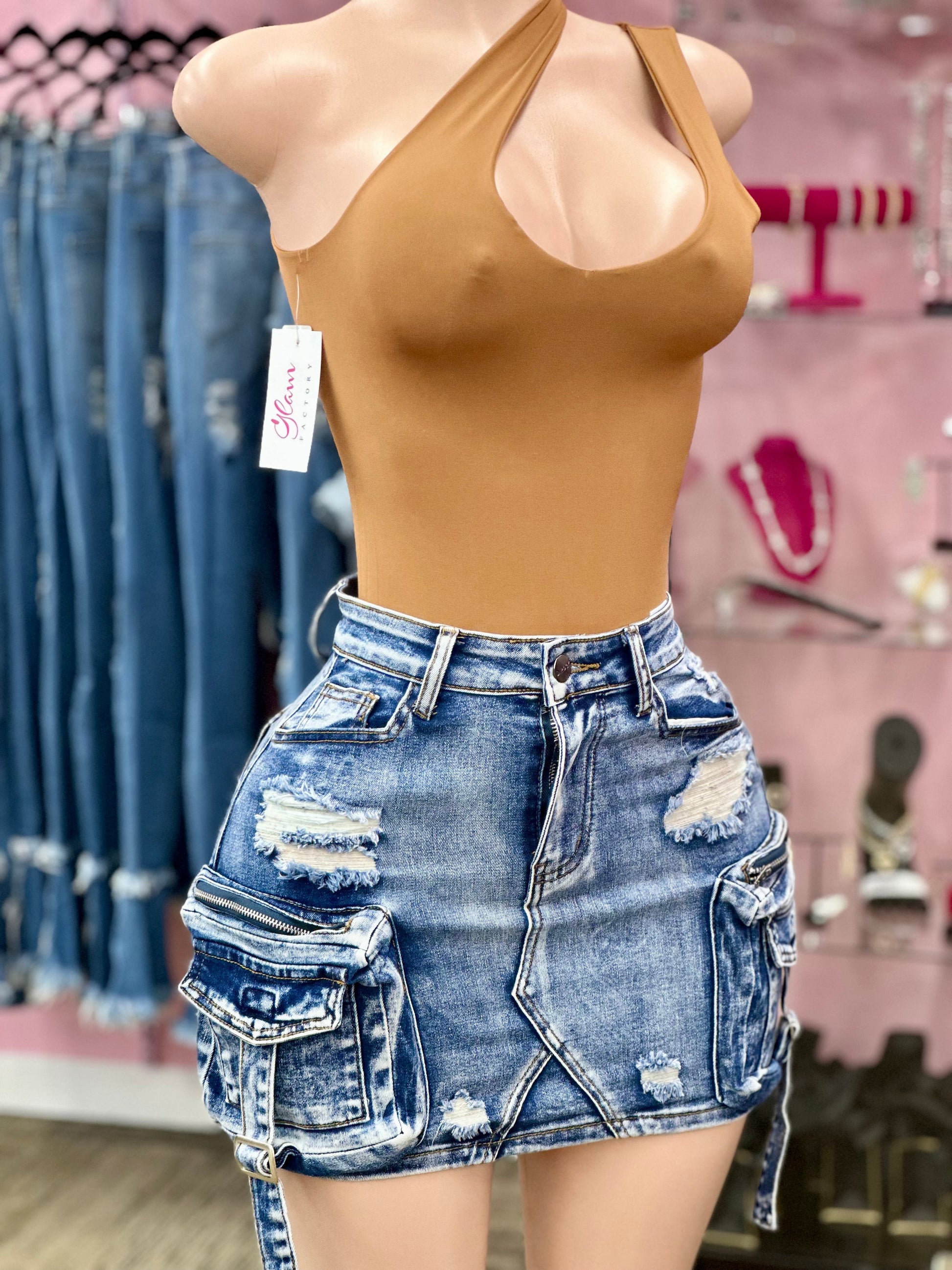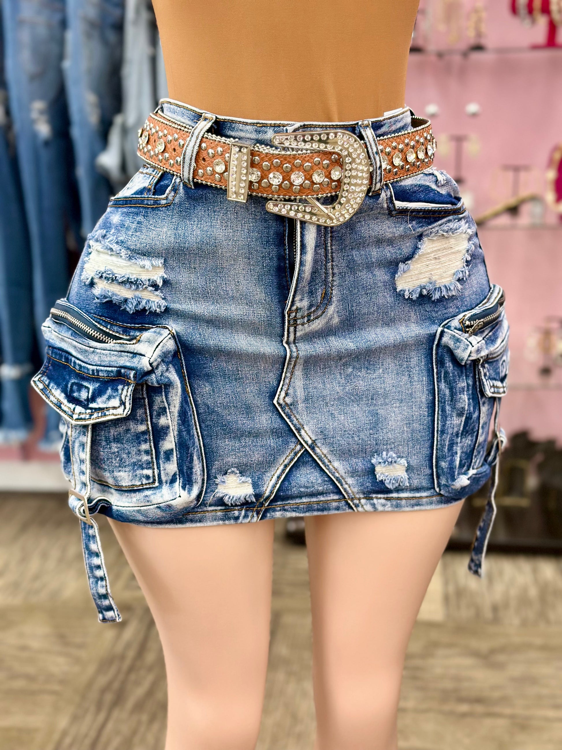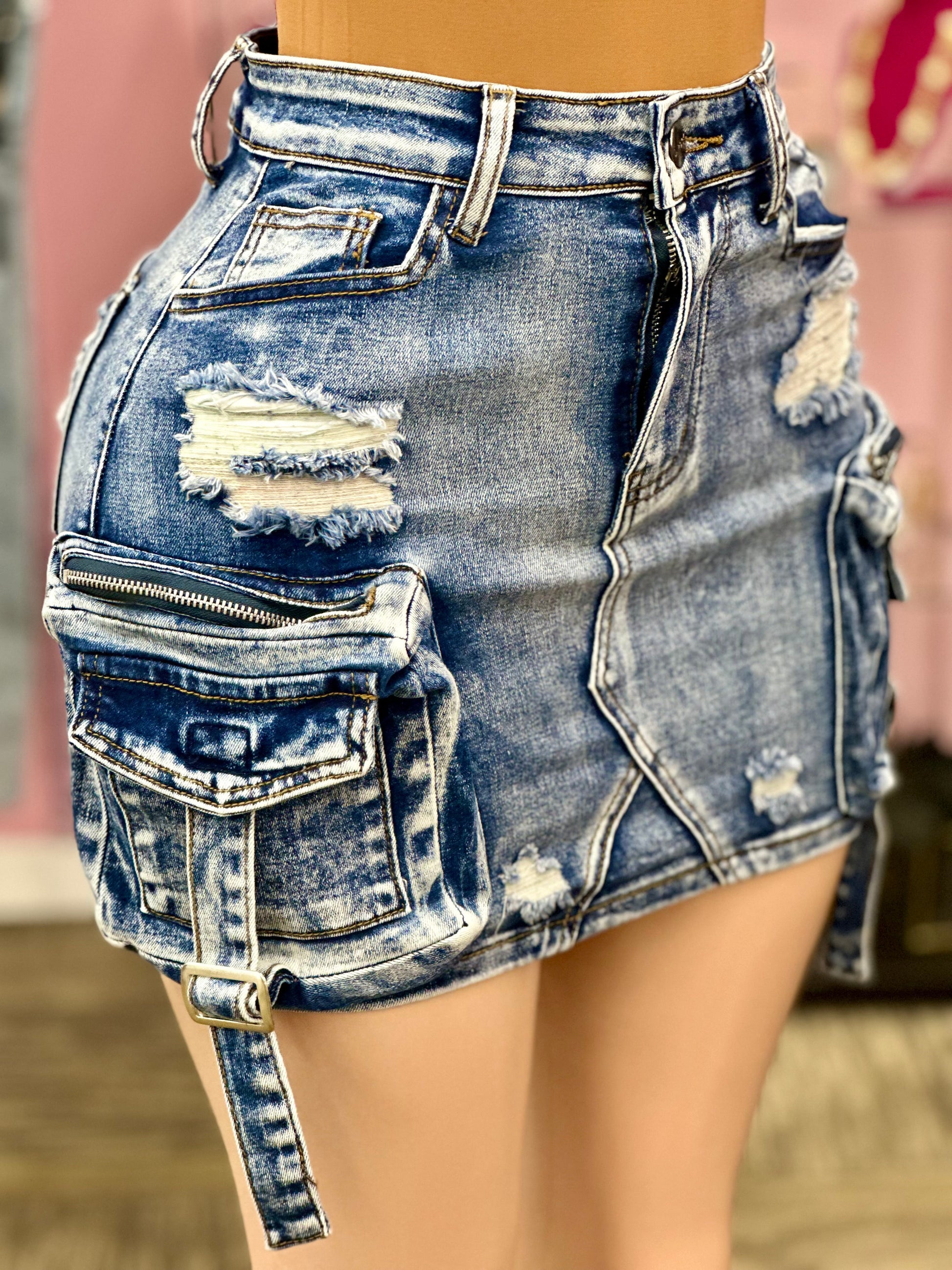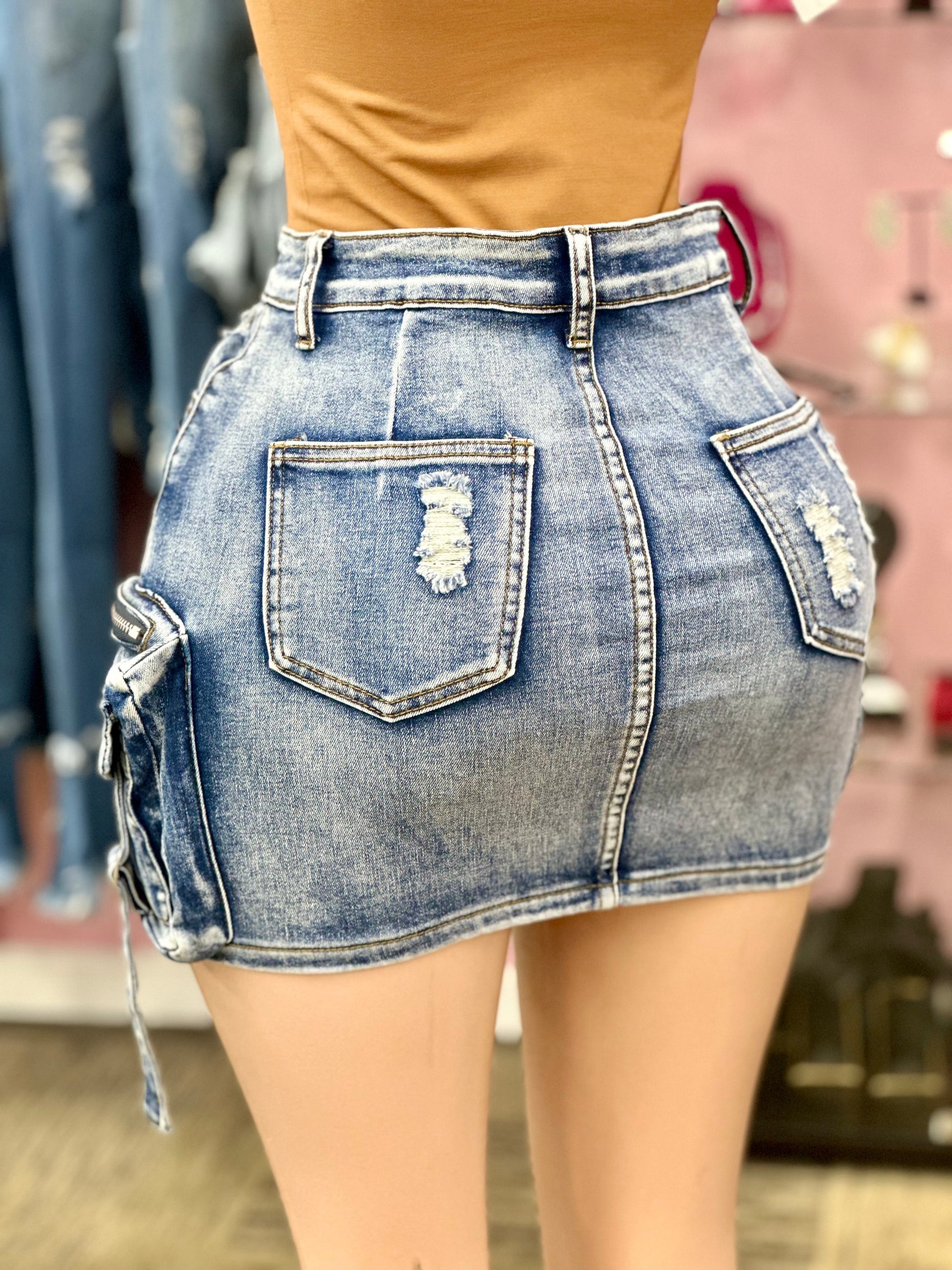 Cargo mini demim skirt with pocket. Stretch material. Fits true to size.